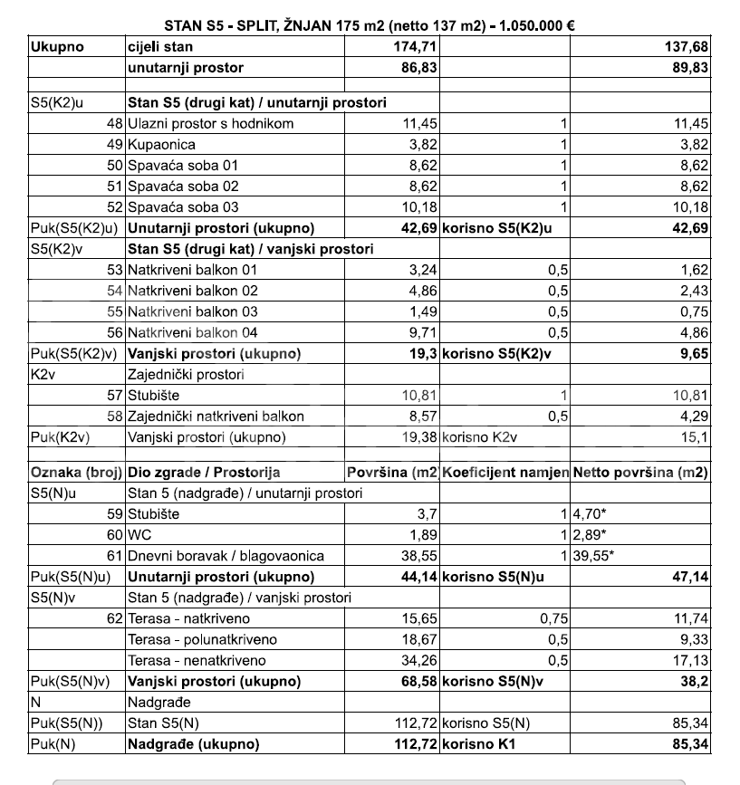 apartment S-5, orientation S-W-N, 3 rooms on the first floor with a bathroom, on the EXTENSION a spacious kitchen, living room and bathroom, as well as a spacious terrace, total 175 m2, = €1,050,000, including two parking spaces in the garage and storage in the building basement.